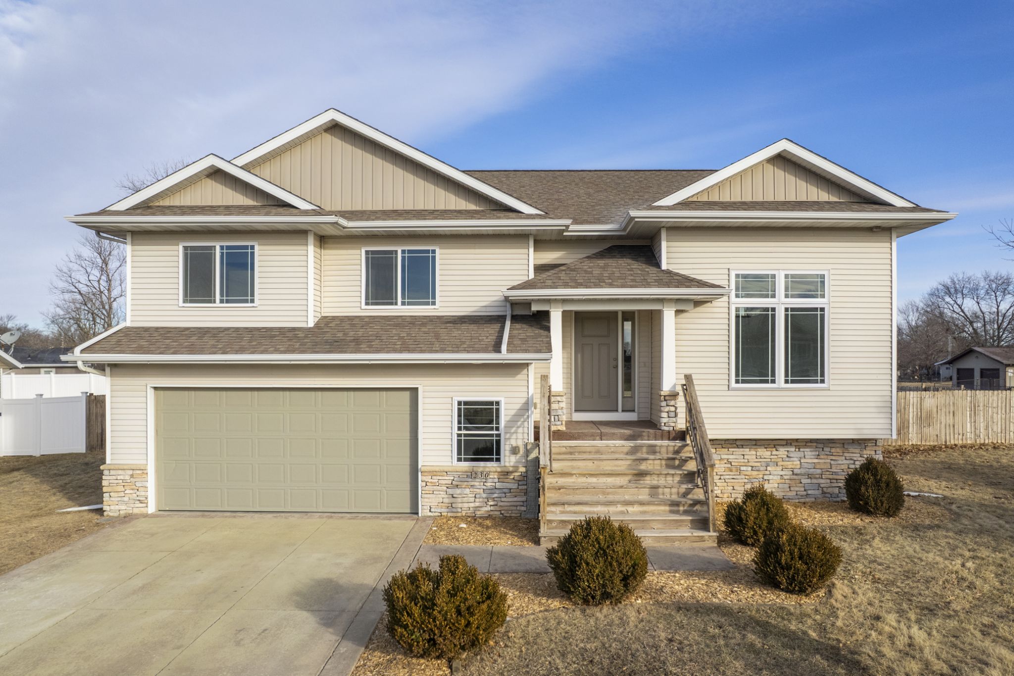 230 Hackberry St, North Liberty, IA For Sale By The Owner Gardenview Homes! Price reduced $10,000 to $389,900 Newly renovated split level home, 2,193 sq ft finished, 3 bedrooms, 3 bathrooms. Huge fenced yard, privacy fence that was power washed and sealed late fall, Huge deck overlooking the yard. Walk out lower level to custom patio. Great location, new paint throughout, new carpet throughout and new LVP flooring in kitchen. Great floor plan with vaulted ceilings in main floor, vaulted ceilings in primary bedroom, many new lights, lights all converted to LED. All built in storage re-painted. Huge family room, walk out basement to huge private fenced back yard. Great Location!